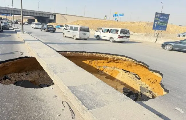 وقع هبوط أرضى بمحور الأوتوستراد بسبب تسرب مياه وقامت إدارة المرور بعمليات تحويلات