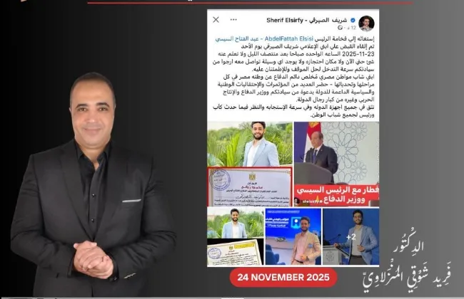 أصدر الدكتور فريد شوقي المنزلاوي، أحد أبرز صناع الرأي العام، بياناً عاجلاً وحاسماً، يناشد فيه رئيس الجمهورية بالتدخل الفوري لكشف ملابسات اختفاء الإعلامي شريف الصيرفي الذي فُقد فجر الأحد 23 نوفمبر 2025، واعتبر أن هذا الحدث "رسالة خطيرة تمس حرية الإعلام وكرامة المواطن".