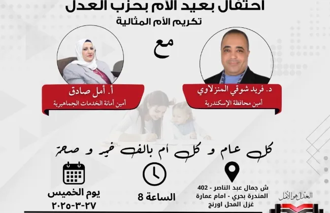 بعد قليل.. انطلاق حفلة عيد الأم في حزب العدل بأمانة الإسكندرية