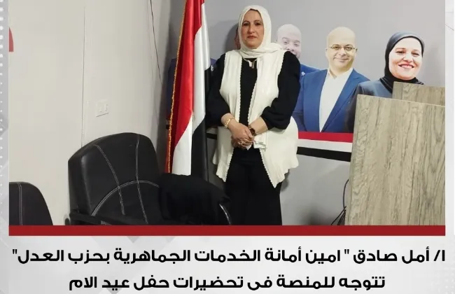 توجهت الأستاذة أمل صادق، أمين أمانة الخدمات الجماهيرية بحزب العدل، إلى المنصة ضمن الاستعدادات الجارية لانطلاق احتفالية عيد الأم، التي ينظمها الحزب بالتعاون مع موقع "صوت مصر".