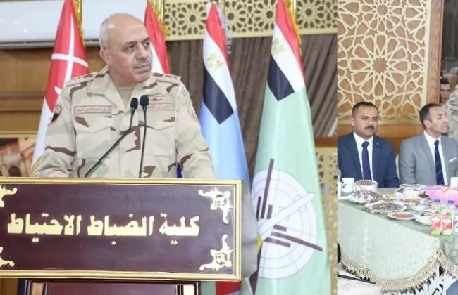 الفريق أحمد خليفة يتناول وجبة الإفطار مع أعضاء هيئة تدريس وطلبة كلية الضباط الاحتياط
