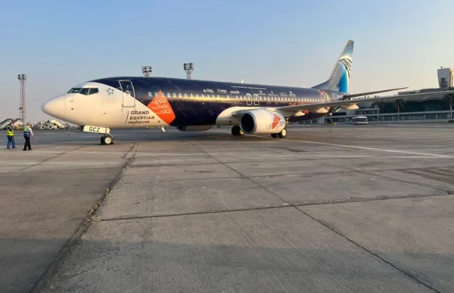 مصر للطيران تحلق بطائرة مزينة بالكامل بشعار المتحف المصرى حول العالم