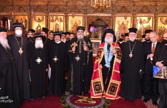 رحب البابا ثيودورس الثانى بمحمد رضا مندوب رئاسة الجمهورية الذى حضر لتهنئة طائفة الروم الأرثوذكس