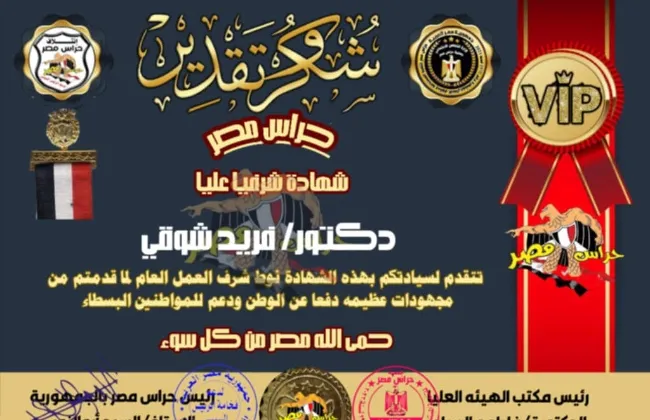 تكريم الدكتور فريد شوقي من حراس مصر تقديرًا لدوره المجتمعي