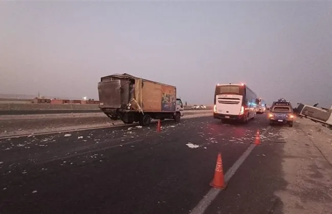 وسيارة نصف نقل بطريق "أسيوط – البحر الأحمر" بنطاق مدينة أسيوط الجديدة، اتجاه مدينة الرحاب