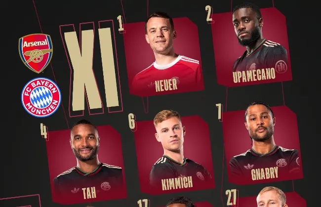 أعلن ناديا أرسنال الإنجليزي وبايرن ميونخ الألماني التشكيل الرسمي لقمة الجولة الخامسة من مرحلة الدوري ببطولة دوري أبطال أوروبا، والتي تُقام بعد قليل على ملعب الإمارات في لندن، في مواجهة تحمل طابعًا تنافسيًا شديدًا بين الفريقين.