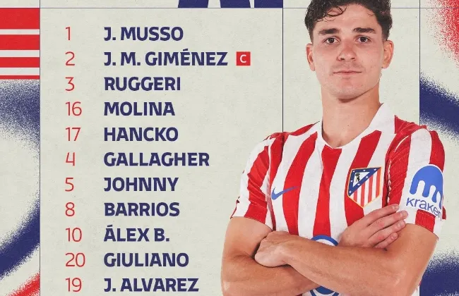 تشكيل أتلتيكو مدريد جاء كالتالي: خوان موسو – ماتيو روجيري – دافيد هانكو – خيمينيز – مولينا – كالاجير – كاردوسو – باريوس – ....