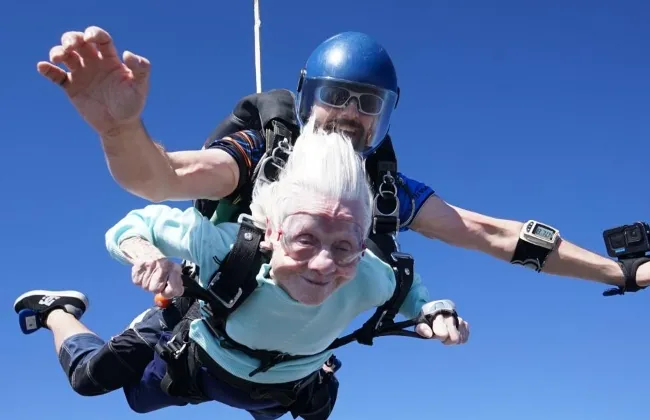 مسنة يتجاوز عمرها الـ100 عام تحتفل بعيد ميلادها بالقفز بالمظلات