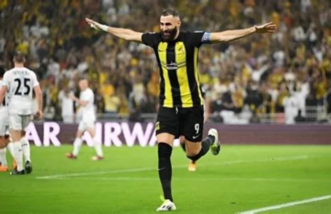 كريم بنزيما يسجل في تقدم الاتحاد ضد الوحدة بثلاثية في الشوط الأول