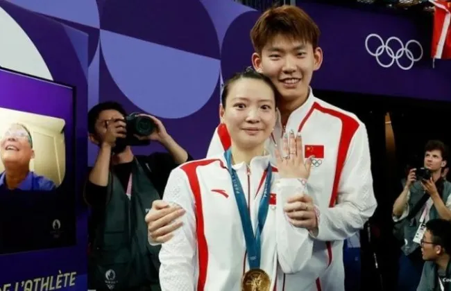 وبعدها فاجأها مواطنها ليو يوتشين، الفائز بالميدالية الفضية فى منافسات الزوجي للرجال، الذى انحنى على ركبة واحدة ليطلب منها الزواج