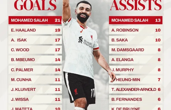 أحتفل نادي ليفربول بنجمة المصري محمد صلاح بعد تصدره قائمة هدافي الدوري الإنجليزي الممتاز. في المباراة الأخيرة ضد بورنموث، سجل هدفي الفوز، مما عزز صدارته ترتيب الهدافين برصيد 21 هدفًا. ونشر الحساب الرسمي لنادي ليفربول على منصة "اكس" وكتب صلاح يواصل صدارة الدوري الإنجليزي الممتاز، ونشر قائمة الهدافين والأسيست. ترتيب هدافي الدوري الإنجليزي الممتاز ....